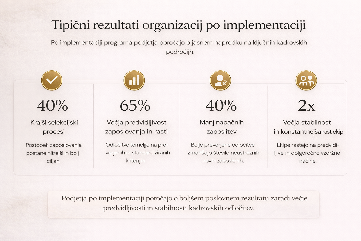 Program ni namenjen podjetjem, ki iščejo le posamezne izboljšave, temveč organizacijam, ki želijo sistemski premik v načinu kadrovskega odločanja.